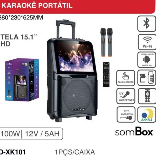 Caixa De Som Karaoke Portatil Com Tela 15,1 HD Sombox D-XK101 100w