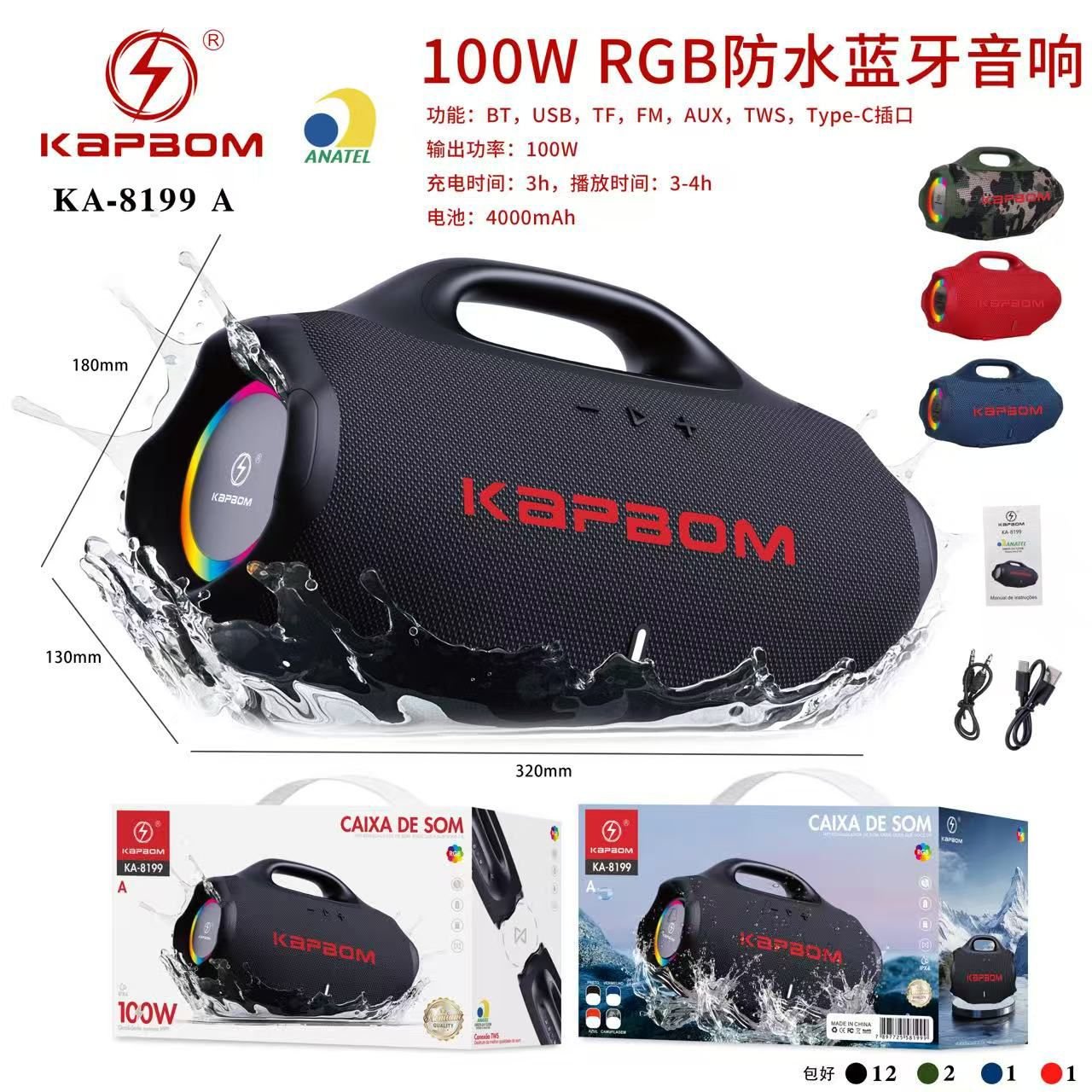 Caixa De Som Bluetooth RGB Resistente a agua Kapbom KA-8199 A 100W