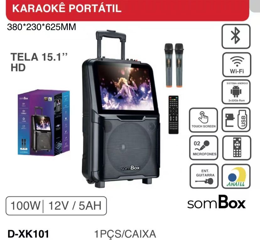 Caixa De Som Karaoke Portatil Com Tela 15,1 HD Sombox D-XK101 100w