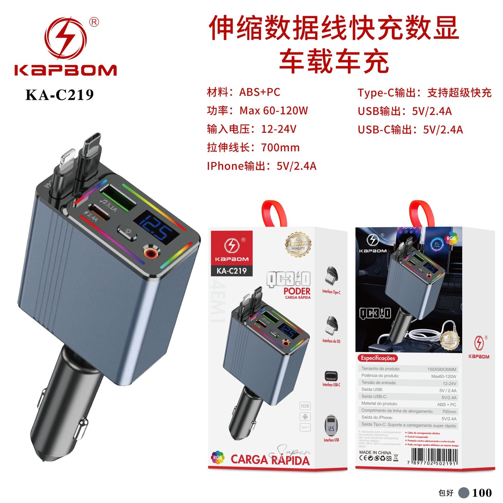 Carregador de Carro Rapido com Display Digital 60-1200w Kapbom KA-C219